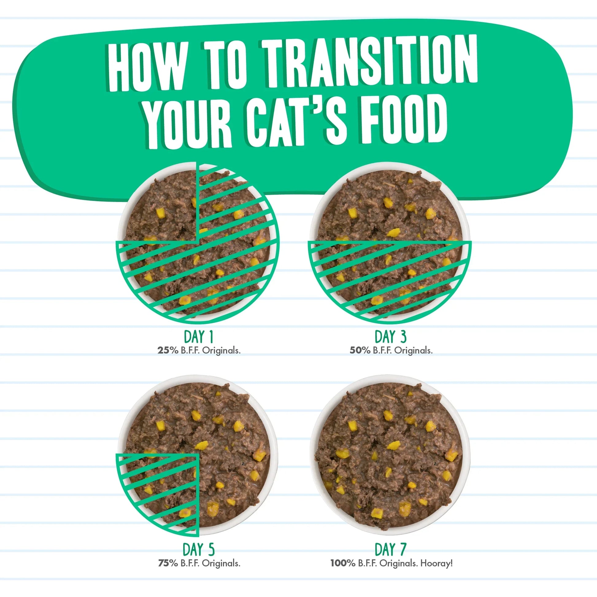Despite how much your feline friends ask for Weruvas high-quality foods, its best to transition them gradually onto a new food over a week. Start by mixing a small amount of Weruva in with their old food and slowly increase the amount of Weruva fed over 7 days. This will help your kitty to adjust to their new Weruva foods Because WeLuvya