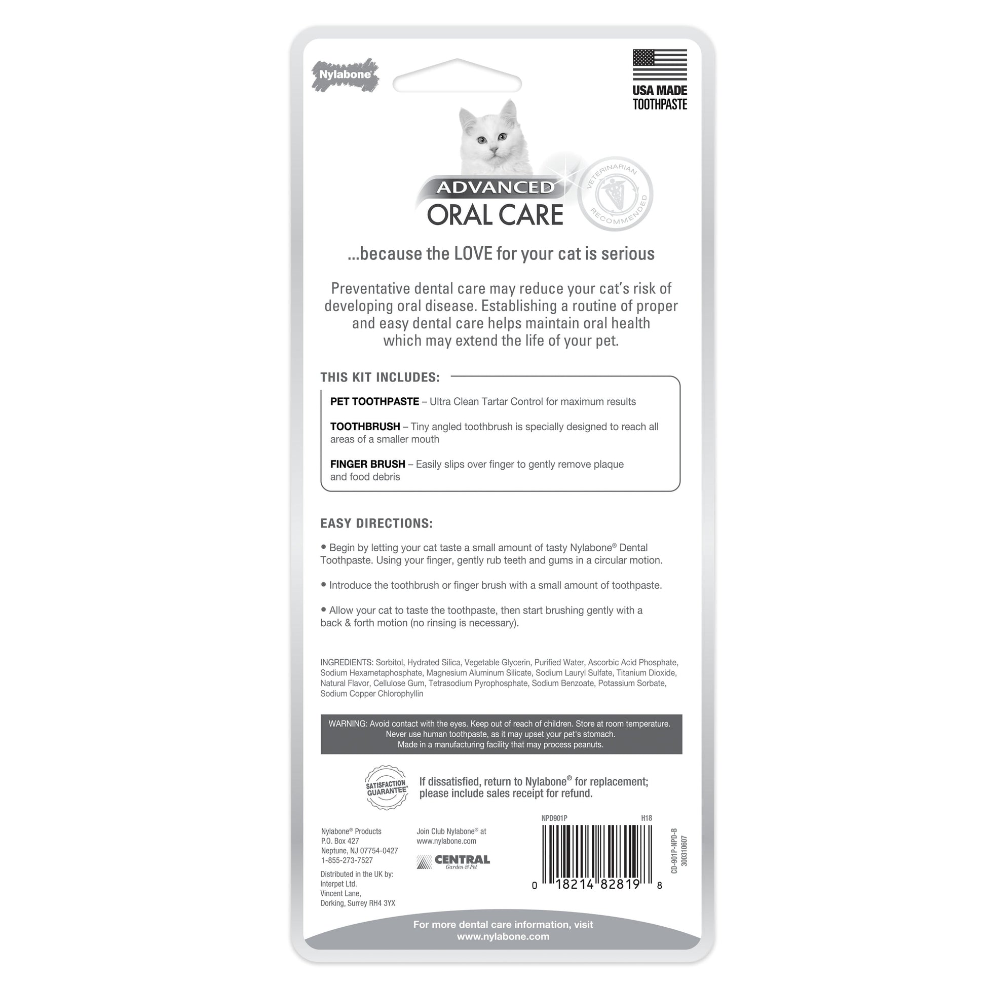 Preventative dental care lowers the risk of periodontal diseasethats why we created this all-in-one cat teeth cleaning kit. Inside, youll find an angled toothbrush that gently massages your cats teeth and helps prevent plaque and tartar through mechanical action. The pet toothpaste features Denta-C, which is scientifically proven to reduce plaque that harbors bacteria. Plus, your four-legged friend will love its delicious original flavor. Slip on the finger brush to easily remove excess plaque and food debris. Vet recommended and pet parent approved, our cat toothbrush set makes dental care simple and convenient! Nylabone Advanced Oral Care provides easy oral care, leaving your cat with fresh breath and healthy teeth and gums|Kit designed especially for cats, with an angled toothbrush able to clean their small mouths|Toothbrush contains ultra-soft nylon tips to clean between teeth while rubber massagers reduce plaque and tartar buildup|Toothpaste made with Denta-C, which is scientifically proven to reduce plaque that harbors bacteria