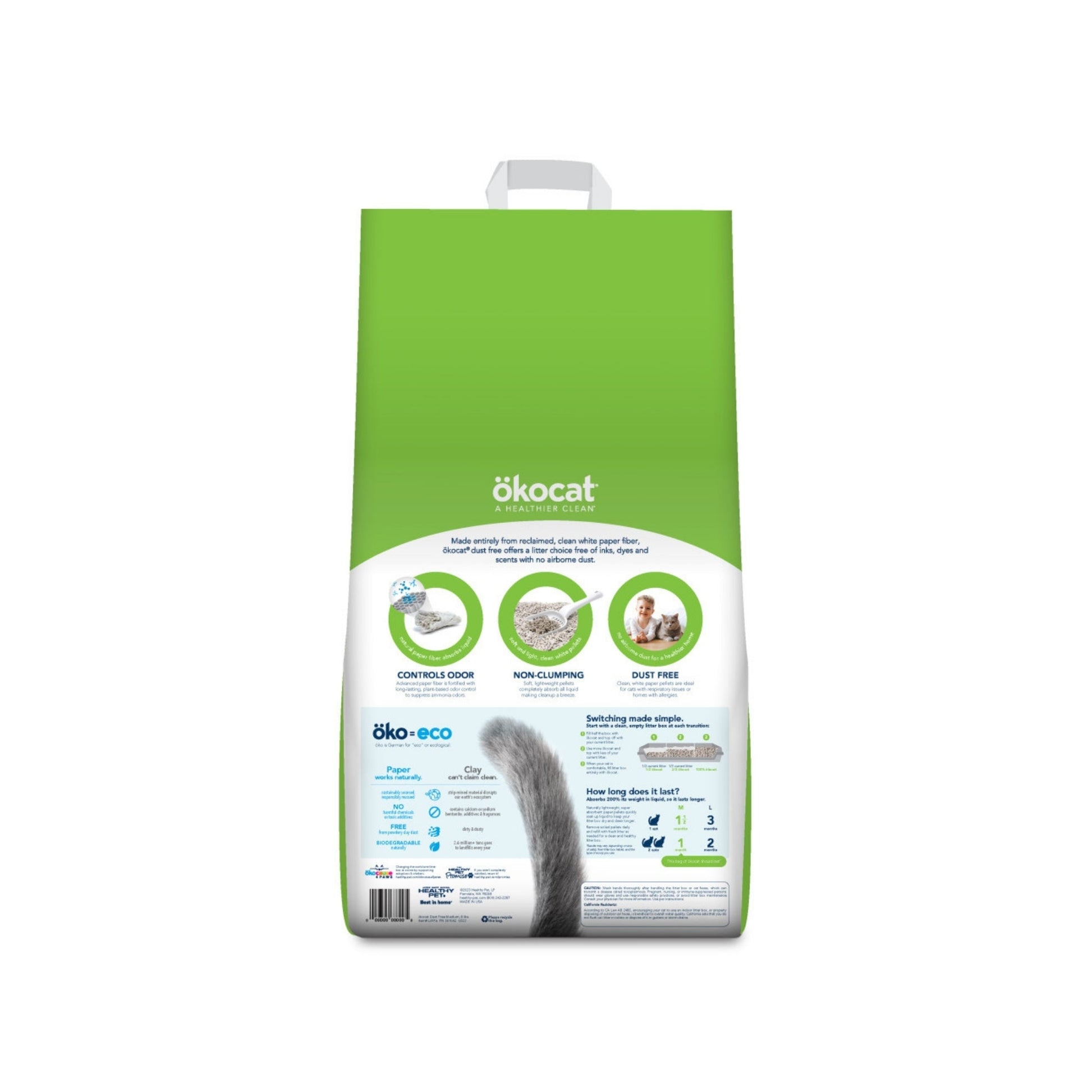 Help your furry friend breathe a little easier with Okocat Dust-Free Unscented Non-Clumping Paper Pellet Cat Litter. This super soft, paper pellet cat litter features low-tracking pellets made entirely from reclaimed, clean white paper fiber. The dust-free formula is fortified with long-lasting, plant-based odor control that suppresses ammonia odors. It creates a cleaner pour that's healthier for your kitty, family, and home and completely absorbs all liquid for easy cleanup. This plant-based litter has no artificial fragrances, harmful chemicals, inks, dyes, mined clay, or silica. It’s the purr-fect choice for cats with respiratory ailments, homes with allergies, or post-surgical needs.