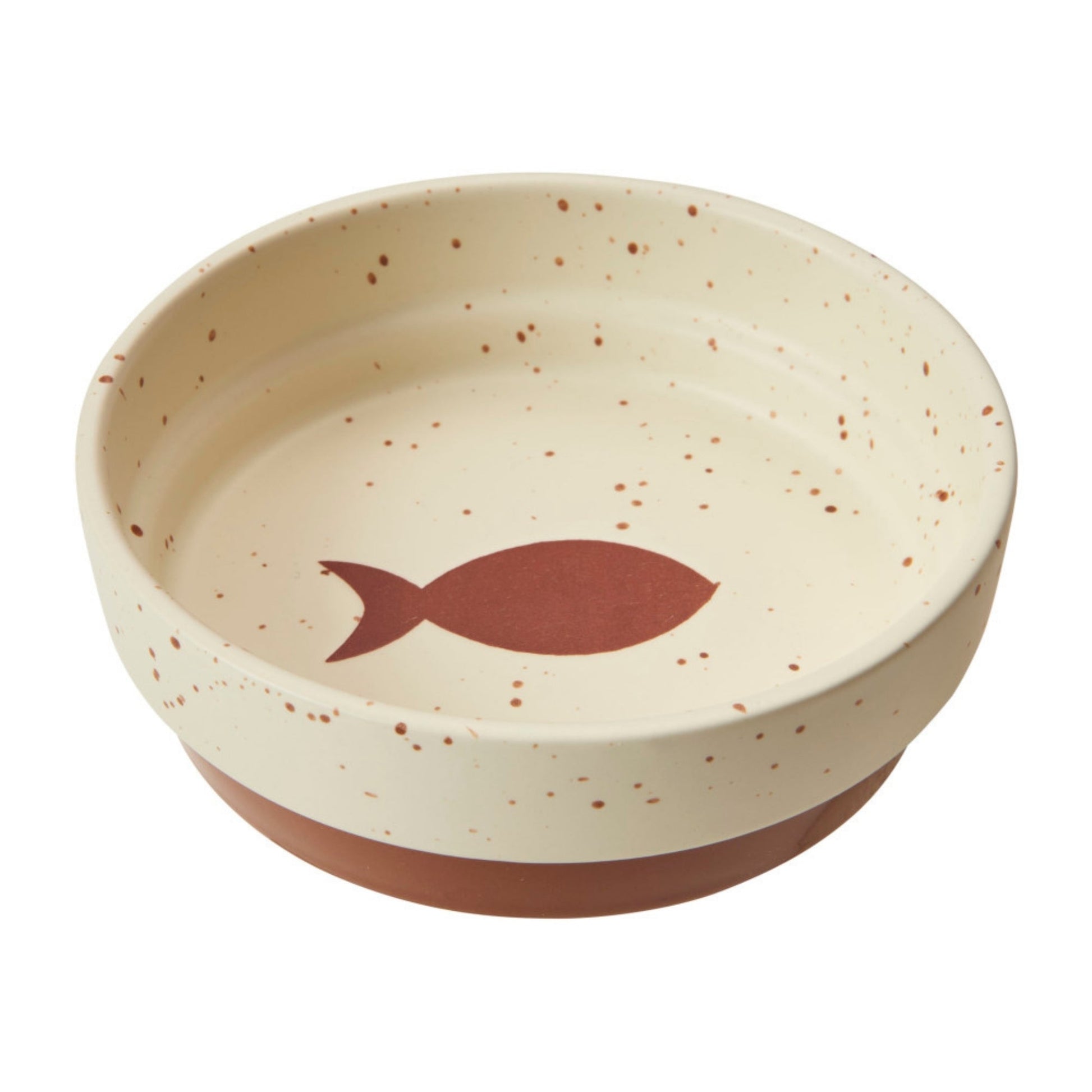 The Sedona dish features earthy tones and a cream colored base. Textured outer finish with a smooth finish inside. Chestnut brown speckled design matches the color of the bottom level of the dish. Matte finish for a more natural look. Fish design on the inside bottom of the 5 cat dish.